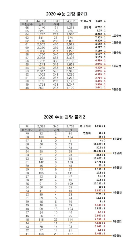 2020 물리1 = 만점자부터 4등급 중간까지 남자 우세