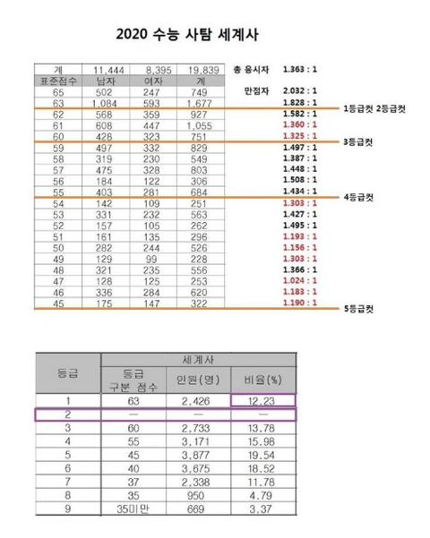 2020 세계사 = 만점자부터 4등급까지 남자 우세