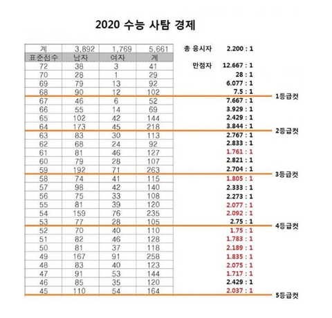 하... 남자들이 정말 이것마저 지는 건 싫었는지 대놓고 통계조작을 한 게 드러나는 순간이지. 여성들에게 의도적으로 점수를 낮게줘서 1등급에서 거의 1.5~3배가까운 비율차이를 보이는 게 보일거야. 우리 사회의 유리천장을 너무나도 적나라하게 보여주는 거 같아.