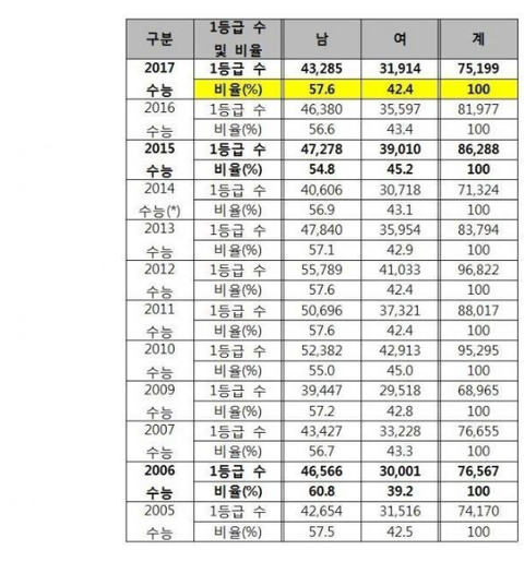 여기에는 2017년까지 밖에 안나와있지만 사실 작년 수능까지도 상위권은 남자의 우세였어...