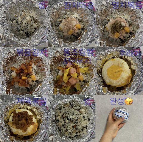 속재료는 계란후라이, 볶음김치, 멸치볶음, 참치마요, 스팸, 단무지 적절히 골라서 사용했어요!