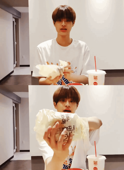 포장 벗기지도 않은 햄버거와 햄버거보다 작은 손