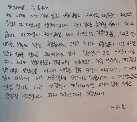 팬들이 빡쳐서 츄라는 여자애한테 사과문을 쓰라고 함