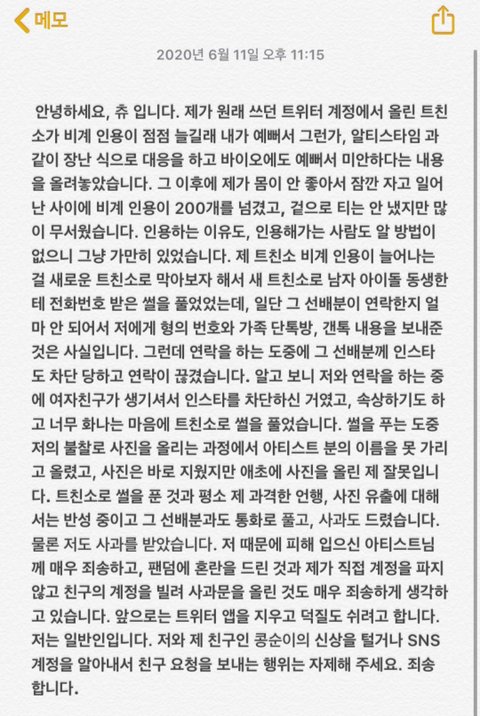 팬들이 빡쳐서 츄라는 여자애한테 사과문을 쓰라고 함