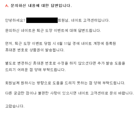 제가 네이트온에 있는 퇴근도장을 열심히 찍었습니다. 그래서 당첨 결과를 기다리고 있었는데, 핸드폰 번호가 이전 번호로 되어있더라구요... 그래서 네이트온에 당첨을 문의해봤더니, 아래와같이 답변이 왔네요. 다른 사람 당첨도 아니고 제꺼인데...누가보면 다른사람꺼 당첨 되었는지 문의하는거 같아요... 제가 이상한건가요??? 다른 사람한테 보내졌다고 문의를 하면, 똑같은 거라도 다시 보내줘야지 정상 아닌가요??? 제가 핸드폰 번호를 잘못 기입한건 실수라 다른사람이 써버리면 어쩔수 없는데... 당첨 결과나 상품을 다시 안알려준다는게 이해가 안되네요...