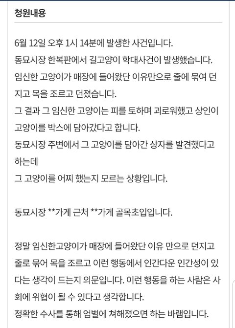 동묘시장에서 임신한 고양이가 매장에 들어왔다는 이유로 줄에 묶어 목을 조르고 던졌대