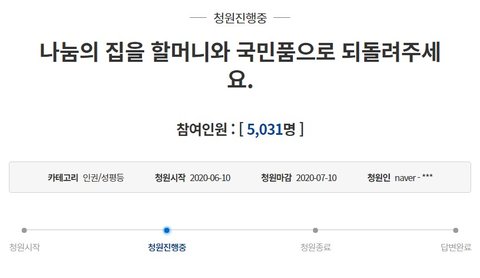 현재 일본군'위안부'피해자 할머니가 생활하시는 나눔의 집 관련 청와대 청원이 진행중입니다.