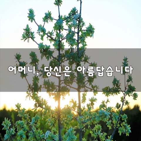 ♥ 어머니, 당신은 아름답습니다 ♥ 어머니란 이름의 너그러움으로따뜻한 사랑을 담아내시는당신은 아름답습니다. 아내라는 이름의 다정함으로밝은 미소를 그려내고 계신당신은 아름답습니다. 언제나 바쁜 일상속에서도사랑으로 감싸 안으시는당신은 아름답습니다. 늘 피로에 지친 몸으로도잊지 않고 사랑을 베풀어 주시는당신은 아름답습니다. 해도 해도 끝이 보이지 않는집안일의 힘겨움을 참아내시는당신은 아름답습니다. 당신의 속내를 보이지 않으려고남모르게 속울음으로 달래시는당신은 아름답습니다. 가정이란 커다란 울타리 속에당신의 일생을 묻으시고조건 없는 사랑을 베푸시는세상의 모든 어머니 당신의 그 거룩한 희생을,당신의 그 숭고한 정신을,당신의 그 아름다운 마음을사랑합니다. - 이재업 -