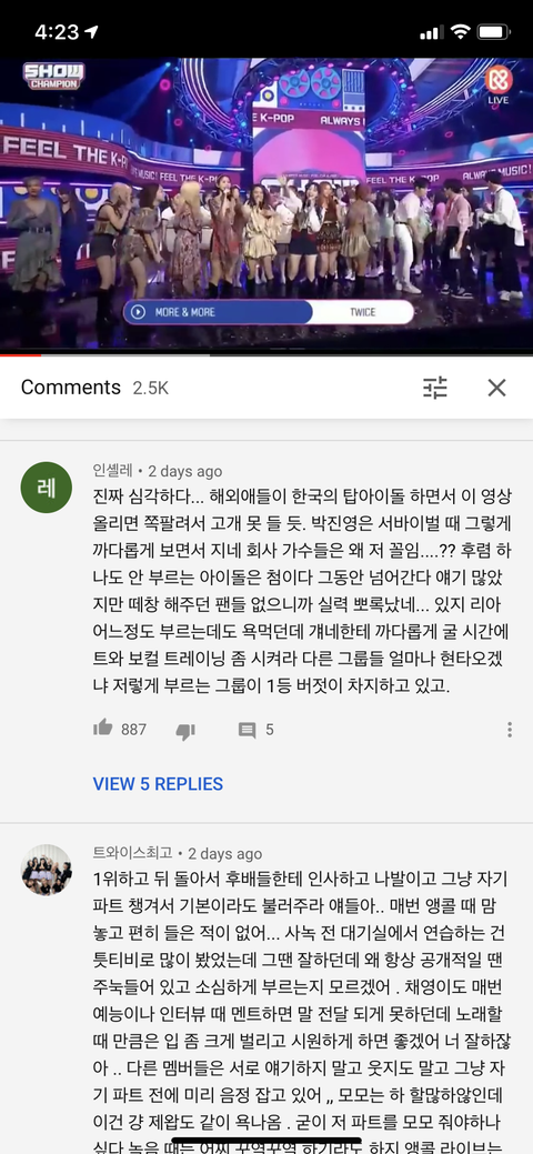 댓글들 보면 좀 너무하다 싶을정도로 트와이스 까는거같은데 솔직히 내가 봤을땐 AR 아예 안들어간 음원에서 라이브하려니까 음정 흔들리고 그러는것 같은데.. 다른 아이돌들 보면 어느정도 원래 목소리가 깔려 있잖아 근데 트와이스는 안 깔려있어서 그런거같음 약간 이때다 싶어서 까는느낌이지 않아?