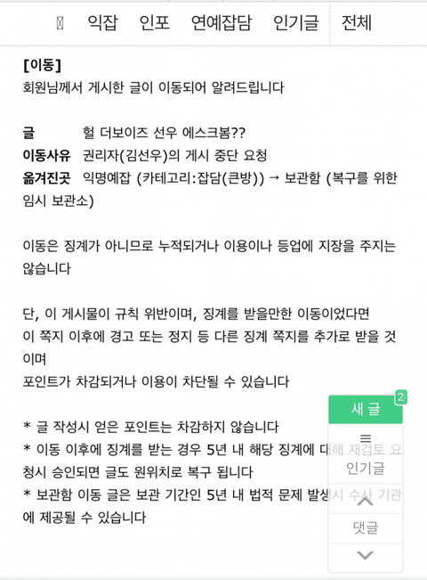 과거 병크 글 멤버 요청으로 삭제 됐었대