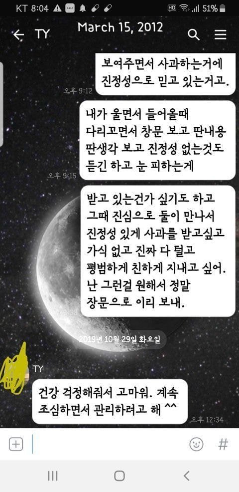 그후에 피해자가 태용이 거짓말했다는거 알고 사과바란다는 카톡 보내니까 그 전에 보낸 건강챙기라는 톡에 답장한거래...