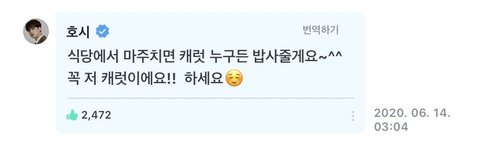 근데 호시도 도겸이 못지않게 착한듯 팬들 식당에서 마주치면 밥 사준다고 말걸라고 해주는 연예인이 몇이나 될까..