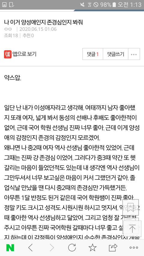 그리고 두 번째글은 난 여태까지 여자 좋아한적 없는데 특정한 사람에게만 양성애가 적용되는지 물어보는 글이었어. 근데 생각해 보니까 범성애자 같기도해. 범성애자는 성별에 상관없이 그냥 사람자체를 좋아 하는거야.