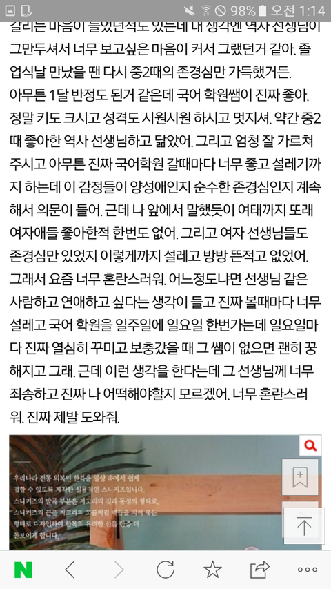 진짜 나 너무 혼란스럽고 그런데 어떡하지. 그냥 내일 아침에 다 까먹고 지내다가 생각나면 진짜 괴로울거 같아. 나 내가 너무 싫고 한편으로는 너무 지금 힘들어. 진짜 내가 너무 어색해서 지금 계속 울컥하는데 나 어떡해야해. 진짜 어떻게 날 받아들일지 모르겠어. 진짜 지금 너무 내가 이상해. 제발 나 좀 도와줘. 내가 스스로 인정해도 그냥 일시적인 생각같고 그래. 17년동안 스스로 이성애자라고 생각했는데 진짜 내가 너무 어색해. 나 어떡하지.