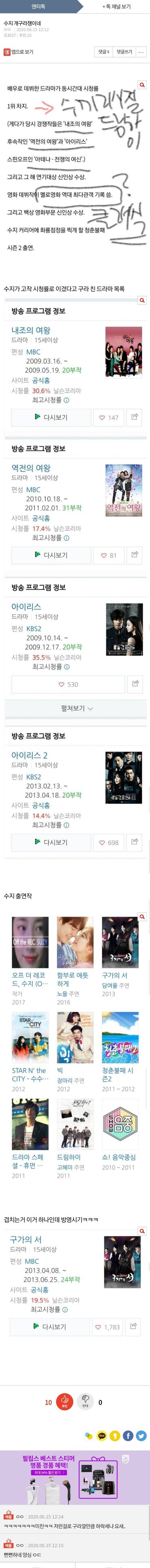 수지까 주작해서 캡쳐 올린거 존웃 ㅋㅋㅋㅋ 수지 드림하이가 당시 정우성 수애 주연 아테나랑 김남주 주연 역전의여왕 누르고 1위한거 맞는데