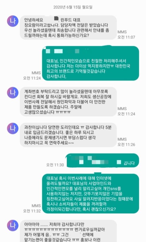 그리고 여러번 죄송하다는 말씀과 함께 제 몸상태를 걱정해주시며 증세를 물으셨고 섭취후 일어났던 반응에대해 대화를 나누었습니다