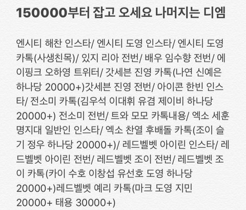 조이 카톡하구 괄호 열구 막 도영 수호 창섭 카이 태용 이런거 조이랑 카톡 한 내용 30000원 이상부터 돈으로 판다는거잖아 ㅋㅋㅋㅋ이거 속는 애들 있냐 ㄹㅇ ㅂㅅ아님?