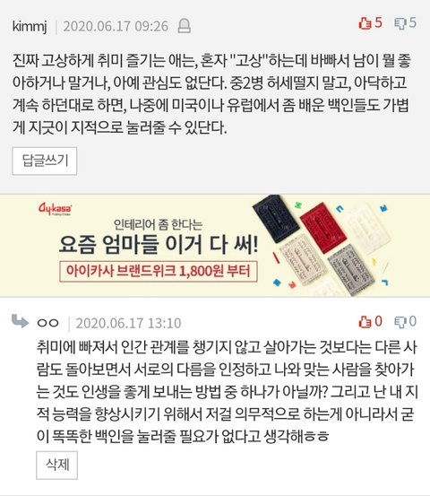 또래 애들이랑 다른 취미 가지고 있는거에 자부심 느끼는 거 아니고 단순히 내 취미뿐만 아니라 그냥 나를 사랑하는 마음을 자만심이나 자의식 과잉으로 치부하면 그것도 문제가 있는듯??