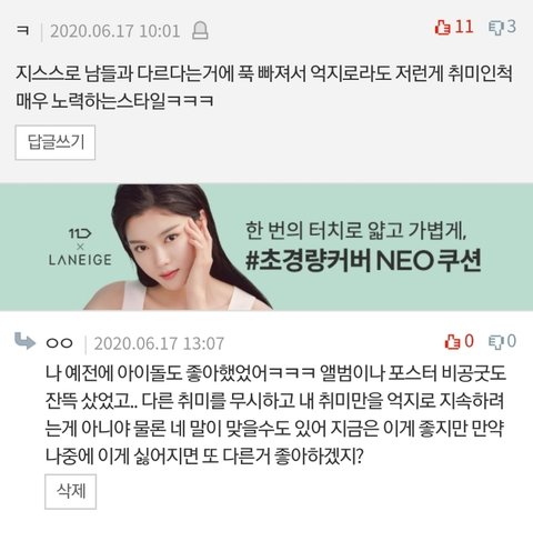 나도 예전에는 아이돌 좋아했었거든 그래서 아이돌 좋아하는 애들 무시 안 해! 이것도 굳이 염려할 필요는 없을듯.. 내가 언제 걔네를 한심하다고 했니 그냥 나랑 맞는애를 찾기 힘들다고 했지.. 내 취미를 강요하지도 않았잖아 그리고 난 그냥 다르다고만 했지 비난 안 했어..