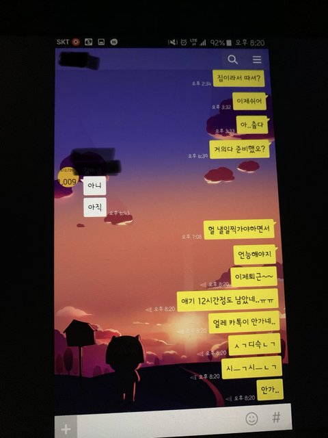 노랑이 남편인데 일할때 저한테 저렇게 보고식으로 카톡 하는데 이게 뭐냐니까 걍 알바생이고 단순 연락한거고 연락한게 기분나쁜거면 사과한다.길래 그럼 애기 는 모냐니까 그건 나이가.어려서 그렇게 부른거라며ㅋㅋ