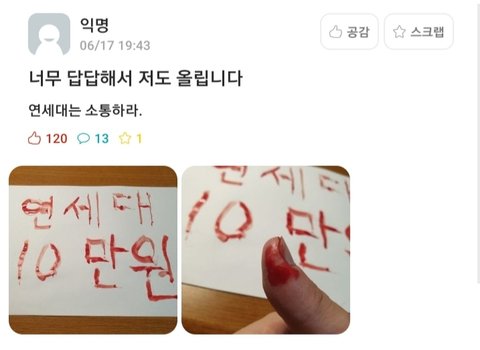 본 글로 현 연세대학교의 상황을 자세하게 설명할 수는 없습니다만 학생들의 당연한 권리를 짓밟는 행위에 대한 분노는 점점 더 커지고 있습니다. 학생을 무시하는 학교에 대해 의사를 표명하기 위해 혈서를 쓴 학생까지 존재하고 학생들은 힘을 합쳐 6/18 수요일, 연세대학교 학생회관 앞에서 시위를 벌일 예정입니다. (물론 총학생회의 지휘 아래 마스크 필수 착용이며 방역 수칙을 철저히 따라 시행합니다.)