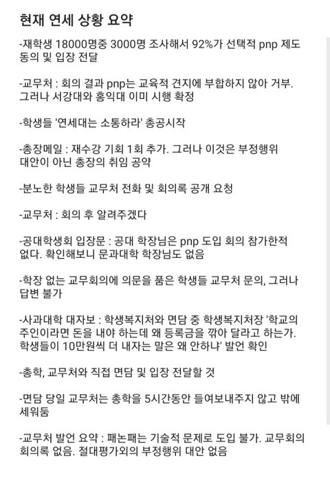 학생들은 현 코로나 사태로 인한 질 낮은 교육&만연한 부정행위 사태에 대하여 최소한의 방어권, 구제권으로 선택적 P/NP 제도를 건의하였으나 연세대학교 교무처는 충분한 논의도 거치지 않은 채 그저 기술적인 문제, 시간의 문제로 인해 불가능하다는 궤변만 늘어놓고 있습니다. (그렇다면 현재 선택적 P/NP 제도를 채택한 서강대, 홍대는 아주 최첨단의 기술을 가지고 계신지..)교무처는 한 학생과의 통화에서 추후 위 제도에 관한 회의록을 공개하겠다고 하였으나 총학생회와의 면담에서는 회의록이 존재하지 않는다며 말을 번복하기도 했습니다. 이처럼 연세대학교는 학생들의 의견을 존중하지 않고 불도저 같은 운영을 이어나가고 있습니다.