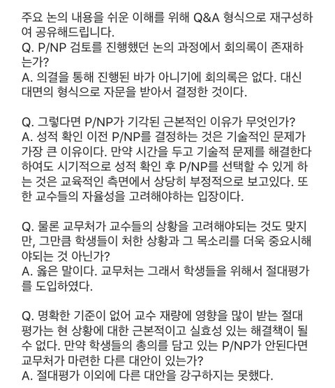 추가) 공부하기 싫어서 선택적 P/NP 제도를 주장하는 게 아니냐고 하시는 분들이 있네요. 본 제도는 강의 질 저하&부정행위로 인한 피해를 보완하기 위한 최소한의 '구제책'입니다. 정당하게 시험 본 학생이 다른 학생의 부정행위로 인해 학점이 낮게 선정된다면 누가 보상해주나요. 현재 학교 측은 보상할 필요를 느끼지 못하고 있는 듯 하고요.