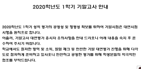 -나를 포함해 지금 대학교 커뮤니티 어플 에브리타임에서 대면시험과 학교의 대체에 대한 말이 많이 나오는 상황. 하지만 학생회나 학교 측에서 학생들의 의견을 들어보려 하지도 않음. 그 흔한 설문조사를 시행하거나 회의 진행도 없이 바로 위와 같은 [2020년도 1학기 기말고사 안내]라는 공문을 올려 버림. 학생들의 의견은 또 이렇게 묵살당했음.