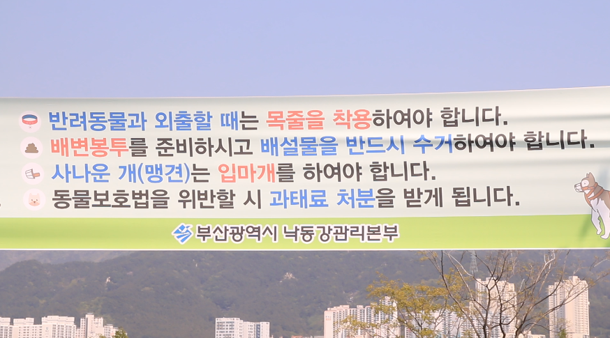 이런 현수막이 걸려있는데도 버젓이 목줄을 풀고 배변도 안치우는 사람이 많더라구요.
