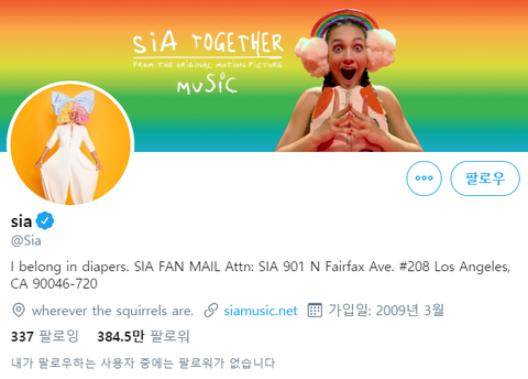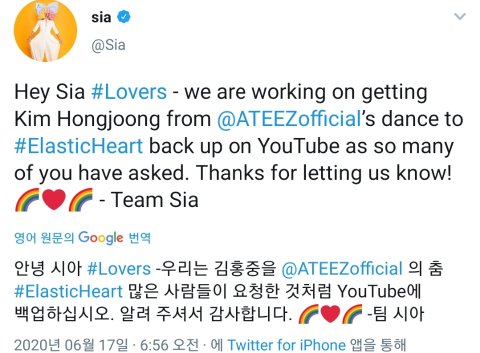 샹들리에 원곡가수 sia님 에이티즈 팔로했더라