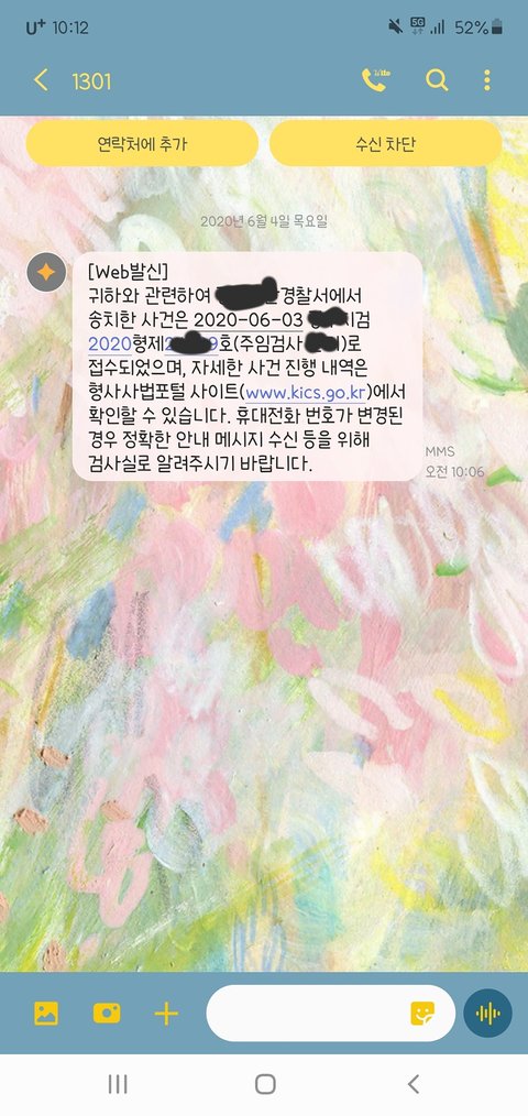 검찰에서도 사건 접수 됐다는 문자 받은지 몇 주가 지났네요.