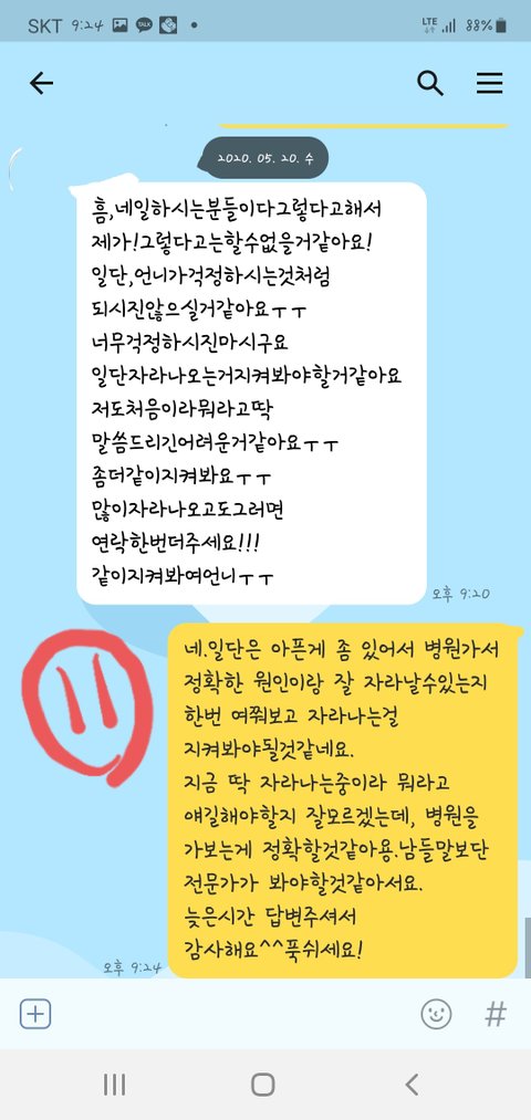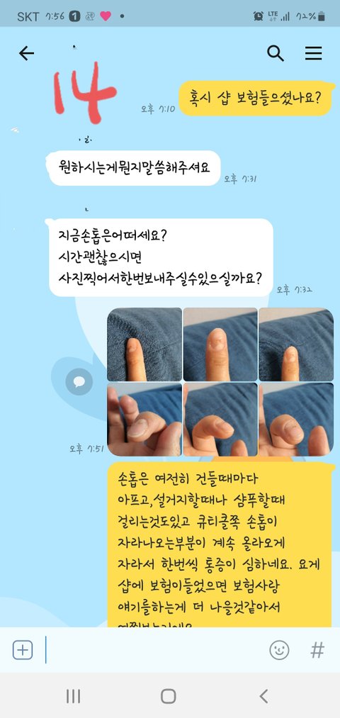 카톡 내용은 제가 처음 손의상처에대해 이야기할때부터 첨부하였습니다.