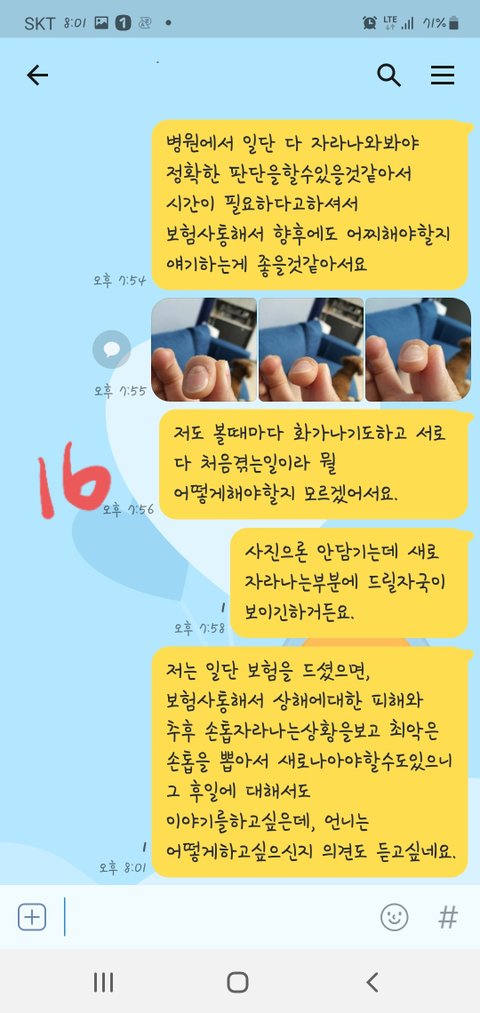 샵사장님이 잘못하신거 아니시라면서 보험처리는 왜 해주신다고하시는지..저는 이해는 안갑니다. 그래도 끝까지 사과해주시는건 감사하지만, 결국 샵사장님 본인은 자신이 입힌 상처가 아니라고 생각을하시는지...휴.
