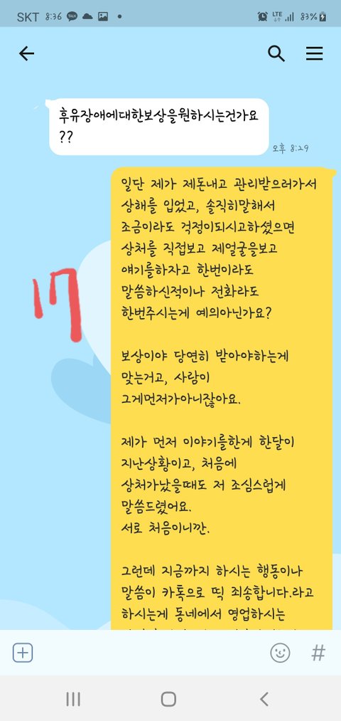직접만나서 상처를보여주며 이야기를하고싶었고, 단 한번의 전화도없이 카톡으로 이야기를하시는게 너무 어이가없었고 제 나름 몇번의 기다림에도 상처가난뒤 얼굴한번못보고 여기까지 오게되었네요.