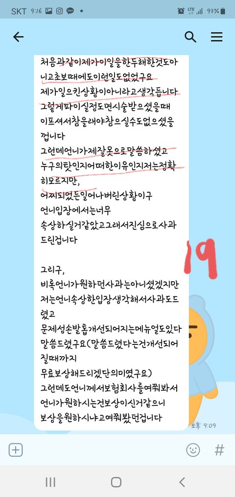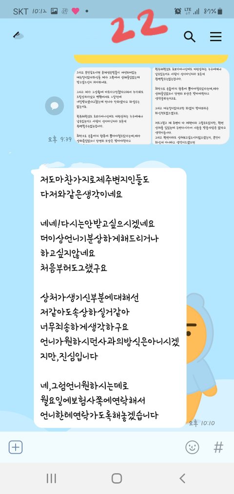 그러던중 이부분에대해 샵이 보험이 들어있으면 샵과 제가 감정싸움없이 해결할수있다는 사실을 들었고, 그동안 수없이 울고 스트레스받은게 극으로 달아오르면서 보험에 가입되어있냐고 여쭤보면서 기분상하지않게 하고싶지만, 상처에대해 크게 관심없어보이는게 화가나서 먼저 사장님이 보셔도 기분나쁠만하게 보내긴했습니다.