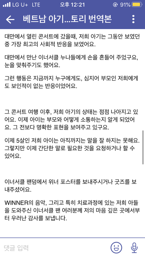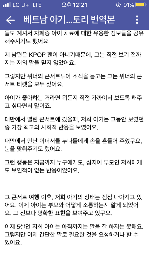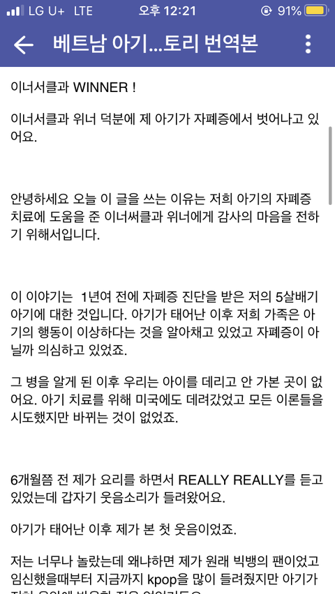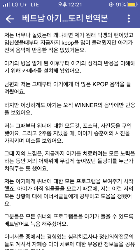 (인티펌)베트남 아기가 태어났을 때부터 자폐 증상이 있어서 미국가서 치료했는데도 차도가 없었는데 k팝 팬인 엄마가 위너 릴리릴리 듣다가 아기가 태어나서 처음으로 웃는걸 봤대ㅠㅠㅠ