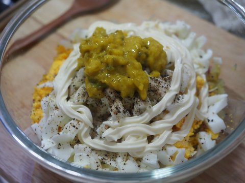 큰 볼에 다 넣고 후추 많이 마요네즈 많이 설탕 한스푼 소금 반에반스푼 머스타드가 없어서 하인즈 핫도그랠리쉬(안에 머스타드 들어있음)