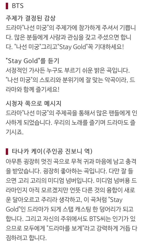 ╋)누가 물어봐서 수정하고갈게! https://www.tv-tokyo.co.jp/rasen/index.html?trgt=2020.03.26,0 나선의 미궁 - DNA 과학수사 OST 3월 26일에 주제가 참여, 노래 제목 발표함. 26일 당일날 남자배우가 음악 미리 듣고 남긴 코멘트. 후에 4월에 드라마 방영이 예정이었음. 방탄은 Stay gold를 드라마 OST로 쓰고 여름 앨범에 수록하기로 했는데 코로나문제로 방영이 지금까지 계속 미뤄짐. 앨범이 먼저 나와버림. 오해생길까봐 덧붙일게