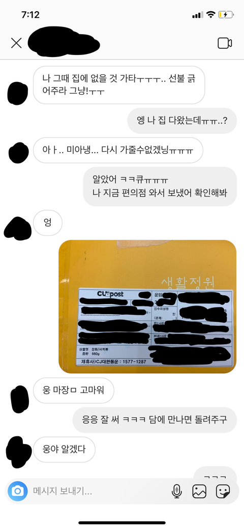 말하고 나서 편의점에 가서 그 물건들을 제외하고도 평소 언니가 취미생활 하는데 필요하고 좋아할 것들도 몇개 같이 넣어서 접수하고 착불택배 보냈습니다 3600원 나왔구요