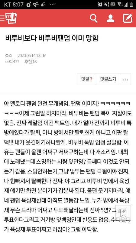 그리고 저글도 그렇고 저 글의 댓글들도 그렇고 성재 불쌍해서 비투비 나왔으면 좋겠다고 한 댓글들 있는데 그런말 되게 무례한거 알아??? 난 비투비 전체한테도 계속 탈큡해 탈큡해 하는것도 무례하다고 생각한단 말이야. 그렇다고 남아있어 하는것도 똑같이 무례하고. 탈큡하면 좋은점도 있겠지만 멤버들이 남고싶다면 남는거고 나간다면 나가는거지 그게 그렇게 쉬운일도 아니고 멤버들의 선택을 존중한다. 그렇게 해야지.
