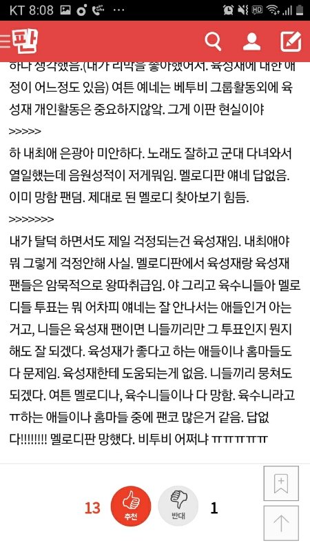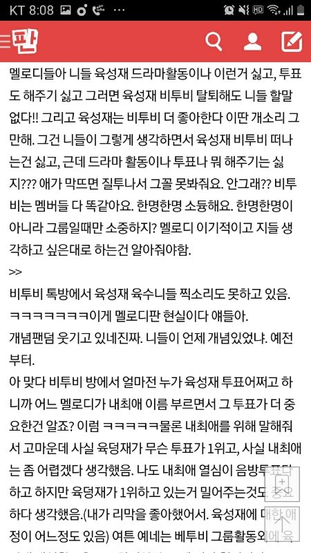 근데 난 딱히 다른 멤버들 최애인 멜로디들이 성재 견제하거나 배척한다는 거 전혀 모르겠거든. 이글에서는 무슨 투표 얘기나왔는데 원래 그런 단톡방에 있는 초딩 멜로디들은 스밍도 안돌리고 투표도 안하고 그런애들 천지잖아...저 글쓰니는 육성재 팬들아 은광이 스밍돌려줘서 고맙다고 하는데 그건 그냥 성재가 최애인 멜로디들이 멜로디니까 돌리는거 아냐??