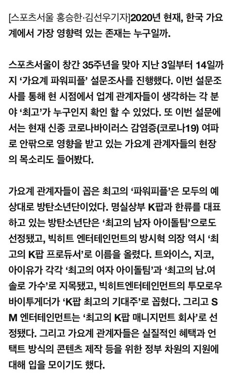 스폿흐서을 창간 35주년 k팝관련 설문조사