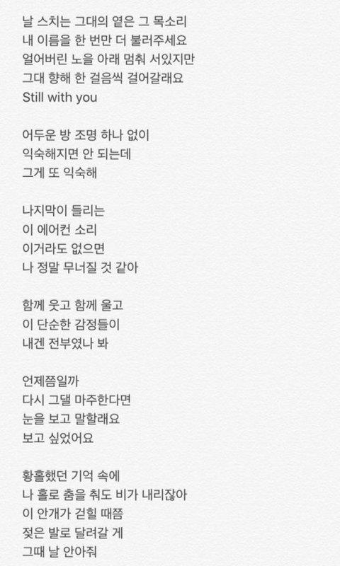 와 나 걍 떠돌이 돌판인생사는 새낀데 ㄹㅇ 눈 딱 한번만 감고 정국꺼 still with you 들어보셈.. 정국이 싫으면 걍 딴 가수라고 생각하고 들어봐 진짜 노래 너무 잘 뽑았음;; 이게 자작곡이라니 ㅅ발