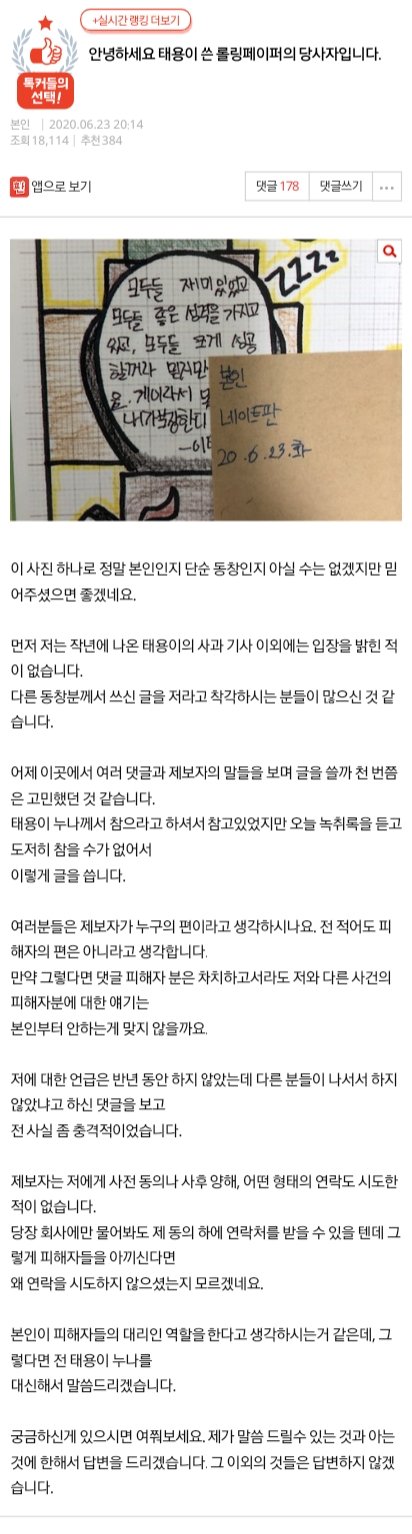 2019년 10월 10일 태용과 댓글 피해자 여학생 첫대면. 서로 모르는 사이. 태용이 고개숙여 2시간 사과하고 용서받았다고 위키트리 기자 기사냄 (학폭이라고 자극적으로 기사냈던 사람)