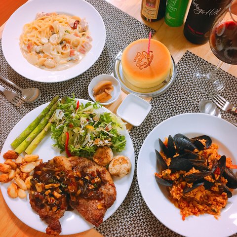 목살스테이크, 해산물리조또, 크림스파게티
