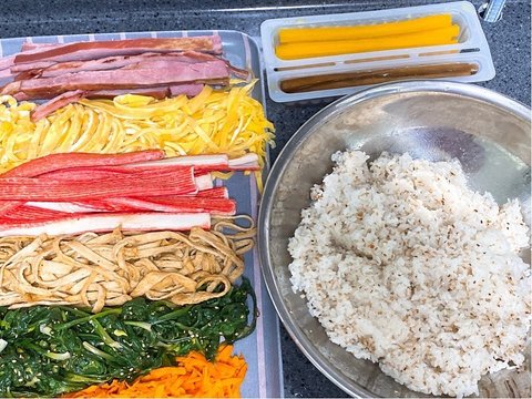 무생채, 콩나물, 호박나물이랑 후라이까지 얹어 비벼먹으면 진짜 꿀맛!