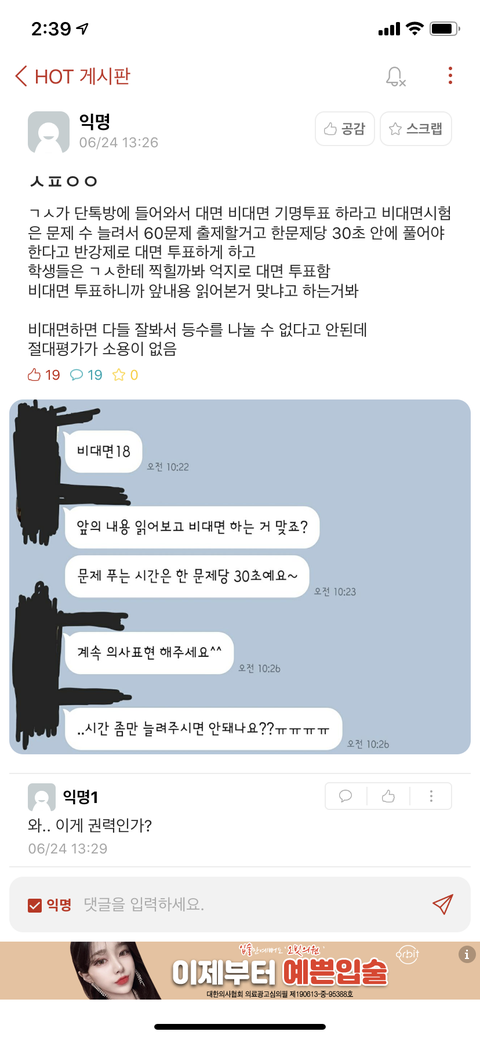 지금 에타에 올라온 내용입니다. 코로나로 인해 비대면시험으로 할지 대면 시험으로 할지 투표하는 과정에 교수님은 저렇게 문자를 보내시면 반 협박식으로 저희에게 대면을 요구했습니다. 이러면 투표의 의미는 뭐가있나요? 심지어 대전은 현재 코로나 확진자 수가 매우 급증하고 있어 고강도 사회적 거리두기까지 하고 있습니다. 매일 5~6명의 확진자가 나오고 있는 가운데 학생들의 의견따위 생각해주지 않는 교수진에 답답함과 실망감을 느끼고 있습니다. 게다가 교수님이 두려워 대놓고 말을 하지도 못하고 이렇게 익명으로라도 말하고 싶네요.