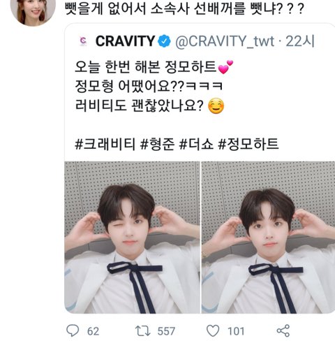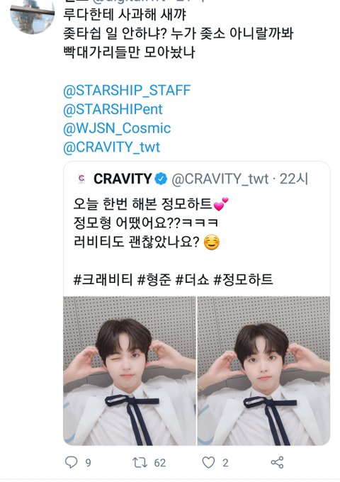 크래비티가 한 하트 우주소녀 멤버가 먼저 한것도 아니고 방탄 뷔랑 경리가 먼저했는데 왜 그 하트가 지들꺼라고 생각하는지 모르겠어 그 트윗 리트윗해서 후배그룹한테 꼰대질한 트윗이 좋아요수 엄청많던데 도대체 왜 먼저 시비걸고 피코질 하는거야? 보니깐 어떤 트페미 우주소녀팬은 다른 걸그룹 까고다니던데 자정하는 사람없고 그 여돌팬들이 자정시키던데 여기 팬덤은 여돌남돌 상관없이 시비거는게 일상임? 전에 방탄도 건들고 또 어떤 그룹 건들지않았냐.. 국내팬덤은 한줌단에 중국팬들이 다하는 그룹인데 외국팬들보다 해준게 없으면서 왜 다른팬덤 건들고 다니는거야? 몬엑 팬덤분들은 후배그룹 엄청 이뻐해주는데 여기는 남돌이라고 가만히있는 후배남돌 비난하고 후배남돌팬덤한테도 역으로 지랄하고 역시 트페미팬덤ㅎㅎ.. 느개비티라고 비꼬지말고 너네언니들 스밍이나 돌려..