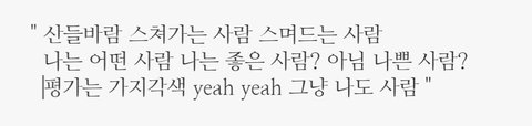 그리고 우리한테도 " 사람들이 널 어떻게 평가하든 그냥 너도 나도 우리는 그냥 똑같은 사람이니까 어떤 사람인지에 대한 정답은 없어 그저 사람일 뿐이잖아 다른 사람이 너에게 보내는 잣대를 신경 쓰지 마 "라고 얘기해주는 것 같기도 했어 윤기가 평소에 노래에서 보여주는 것 같은 묵묵 하면서도 담담한 위로 같은 느낌