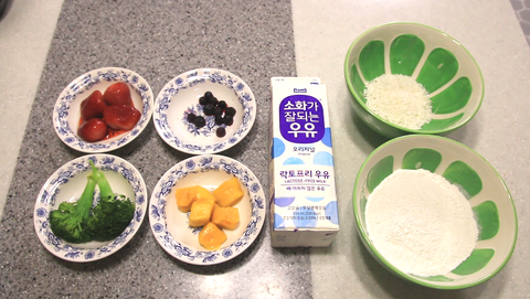 다 짠 후 코코넛가루와 꿀 1스푼을 넣고 잘 섞어 준 후 앞서 갈아 둔 재료에 소분해서 섞어주세요